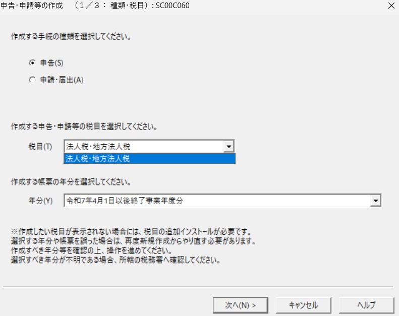 左のタブの“作成”→”申告・申請等”→”新規作成”