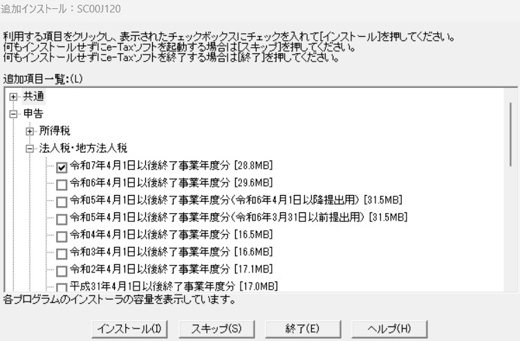 e-taxソフトを開くと追加インストールするかポップアップが出るので、「追加インストール」をクリック。