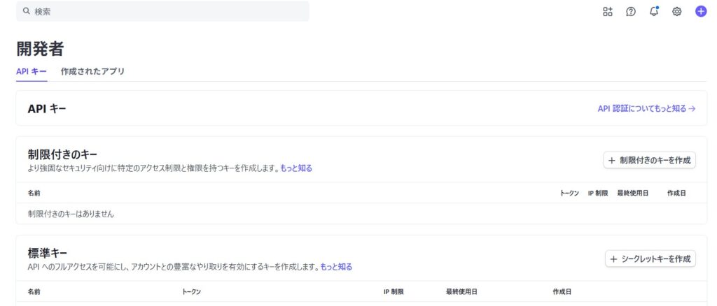 Stripeログインして、”開発者”と検索して、APIキー発行画面を出すこともできます。